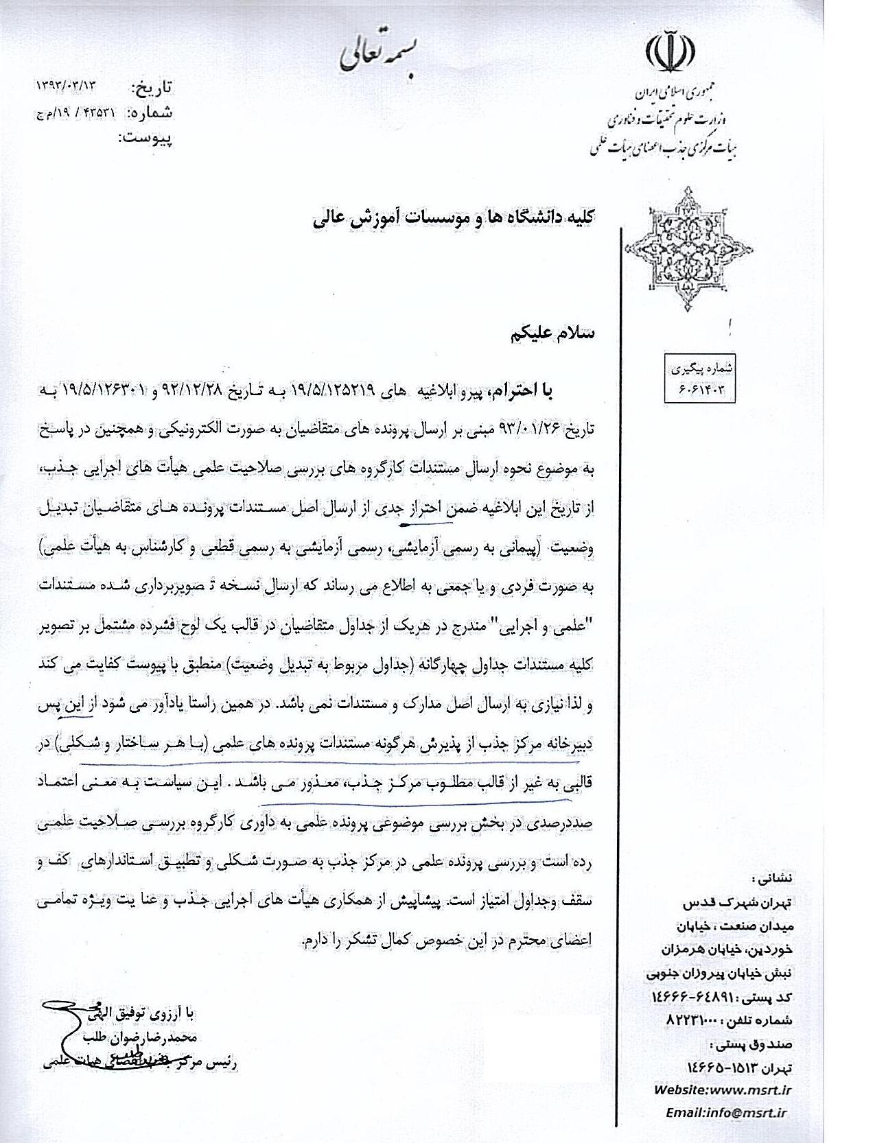 نامه شماره ۴۳۵۳۱/۱۹/ م ج مورخ ۱۳/۰۳/۱۳۹۳ رئیس محترم مرکز جذب اعضای هیات علمی، در خصوص تغییر روند بررسی پرونده های تبدیل وضعیت از پیمانی به رسمی آزمایشی –